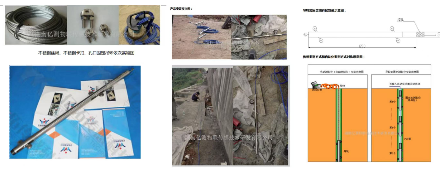固定测斜仪、软性连接的柔性钢丝绳、卡扣、孔口吊环装置、通讯数据线等。工作原理:重力加速度原理,测量地球引力在测量方向上的分量。可沿测斜管导槽滑动到固定深度,多支放置于同一孔内,从而监测整个孔的深部水平位移情况。