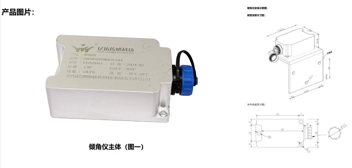 主要作用:YT-ZL-0400系列倾角仪基于重力加速度计原理,可测X/Y方向倾斜变化并得出倾斜方向与角度,能自动化采集数据,适用于观测建筑物等的倾斜变化,偏远地区可无线监测且数据能接入采集系统。