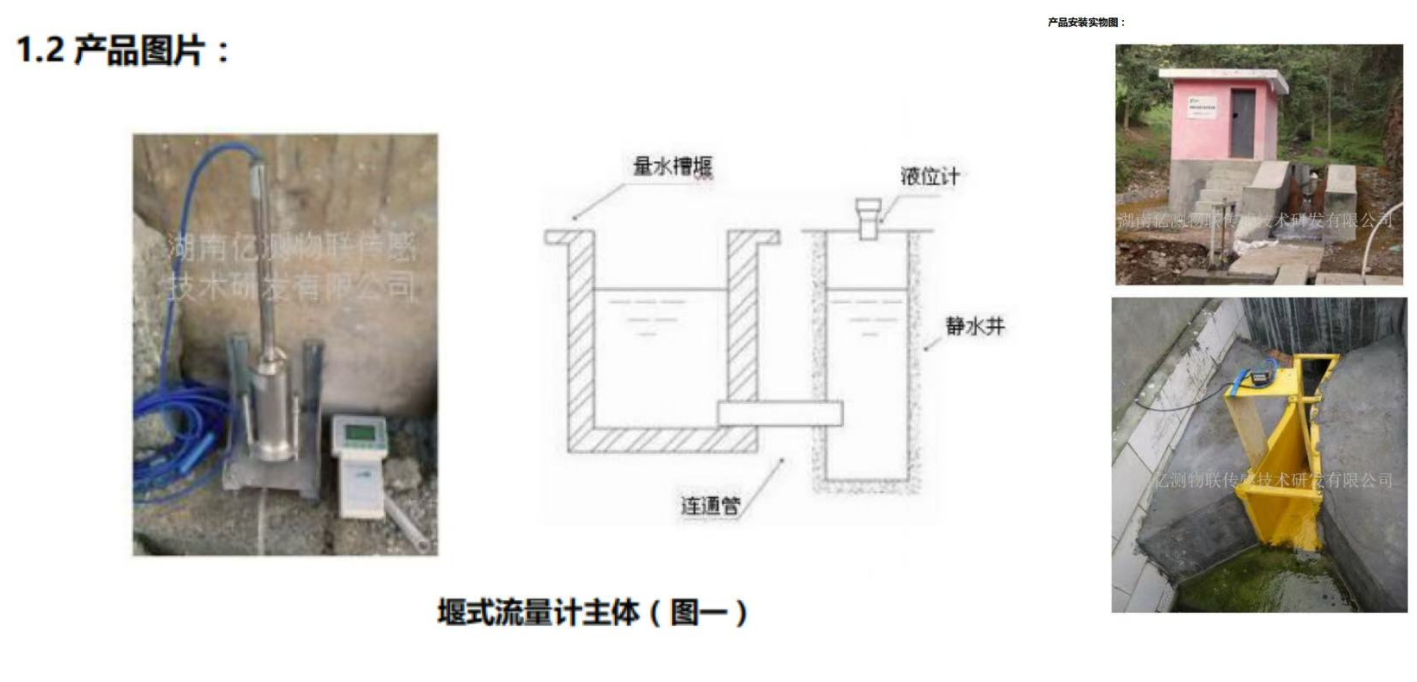 传感器的储液罐底部通过液体连通管连接量水堰槽或者静水井,传感器储液罐内有感应液面变化的浮球,浮球连接传感器的测芯,从而测量水位变化换算流量。(也可采用水位计、超声波水位计做传感器探头)