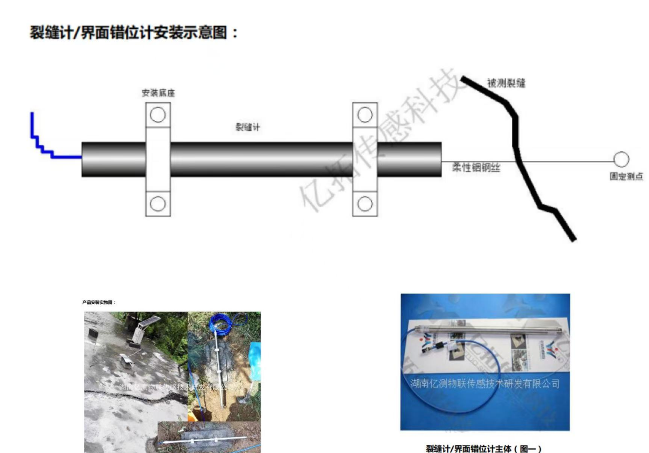 裂缝计本体和柔性位移计\刚性测杆末端固定在裂缝两端,测量相对位移变化。