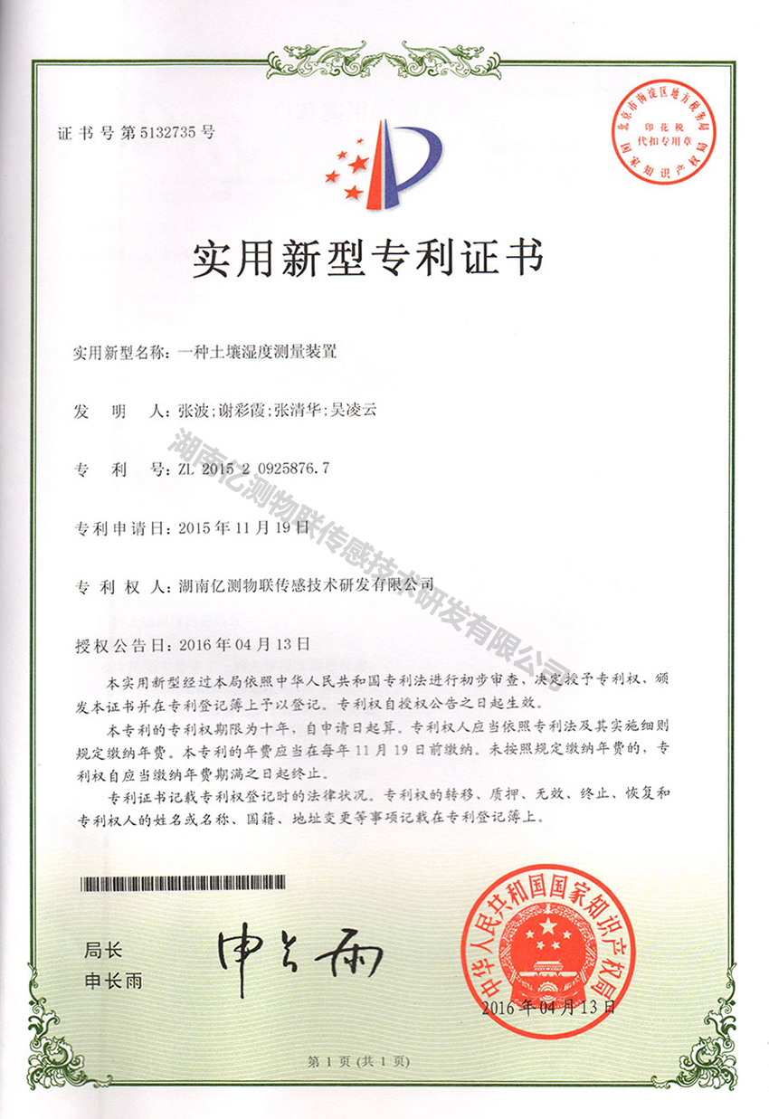 土壤温湿度计专利证书
