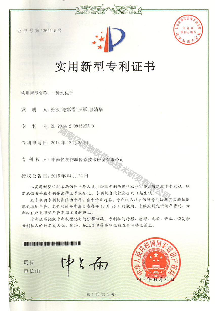 水位计渗压计专利证书