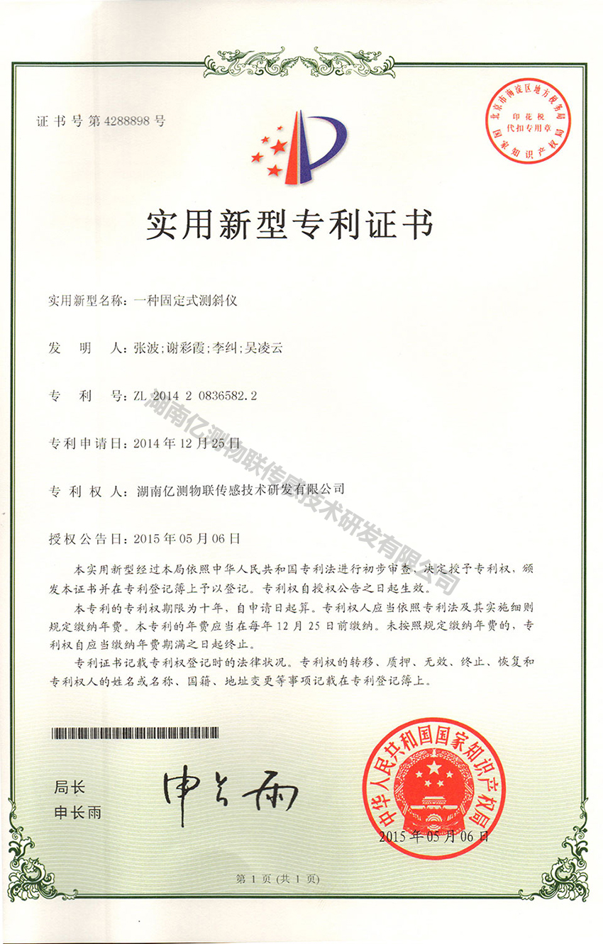 固定式测斜仪专利证书