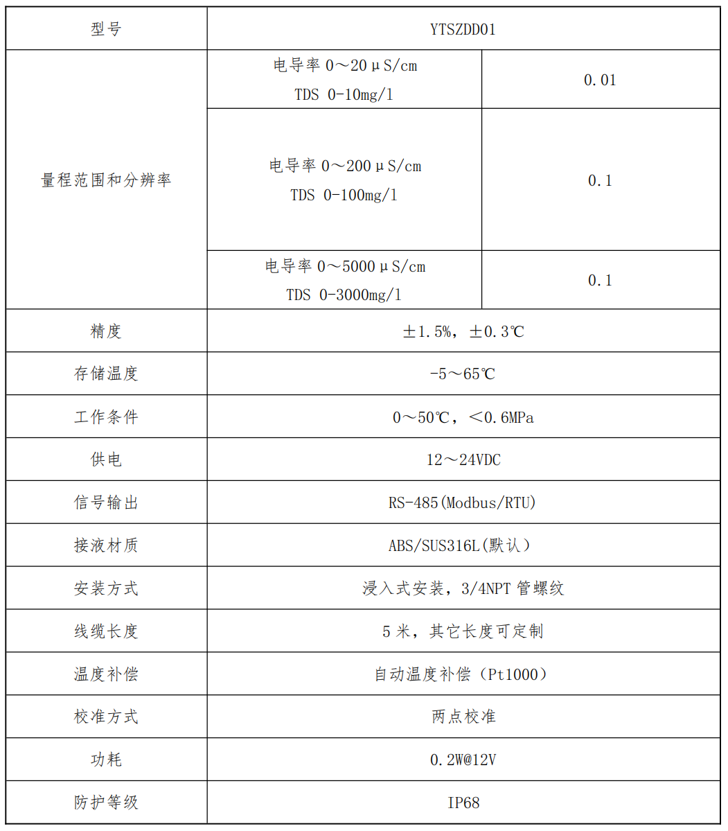 工作原理:根据电解导电原理采用电阻测量法。YTSZDD00系列电导率传感器,通过在两个或多个电极之间施加电压。带正电的离子(如钠离子,钙离子,镁离子,氢离子,等等)向负电荷的电极移动,带负电荷的离子(如氯离子,硫酸根离子,碳酸氢根离子等)将向正电荷的电极移动可用于检测水中总生固体(TDS)的含量,以判断水的洁净或污染程度TDS的测量单位为mg/L,它表示1L水中溶解有多少mg溶解性固体,TDs值越高,表示水中含有的溶解物越多。